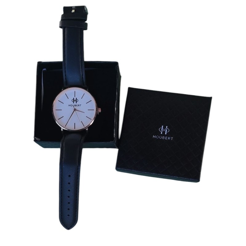 Superbe montre à Quartz Houbert . Style Classique avec Bracelet noir en pvc.